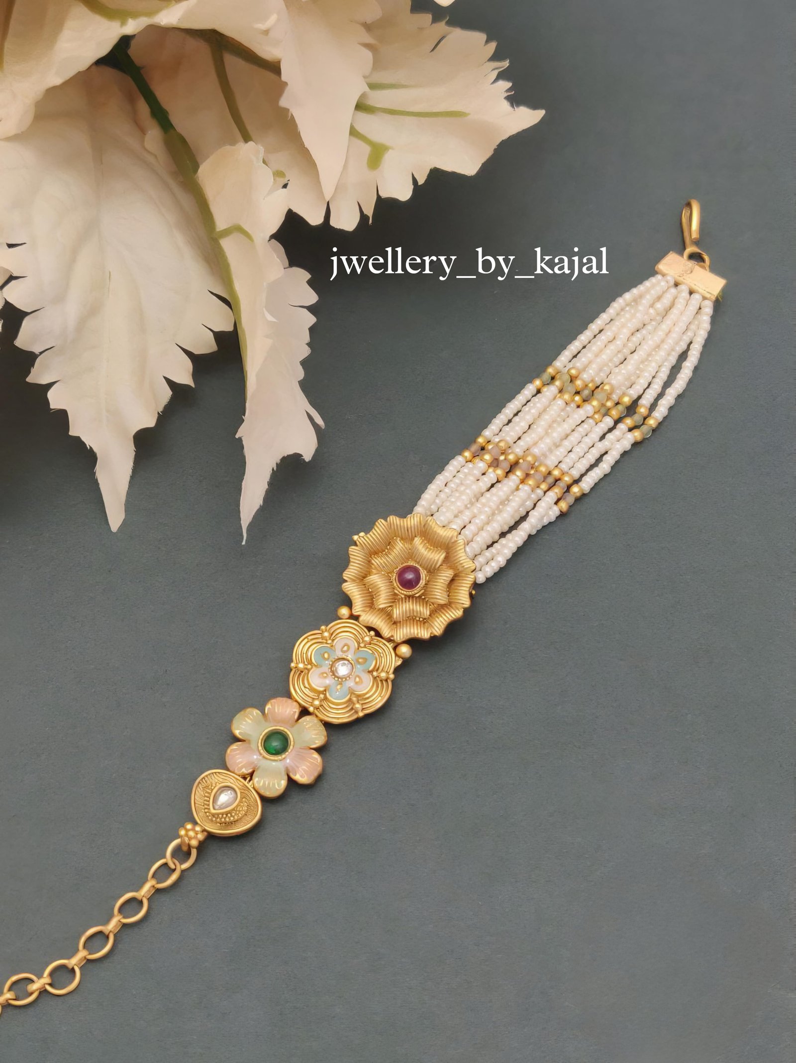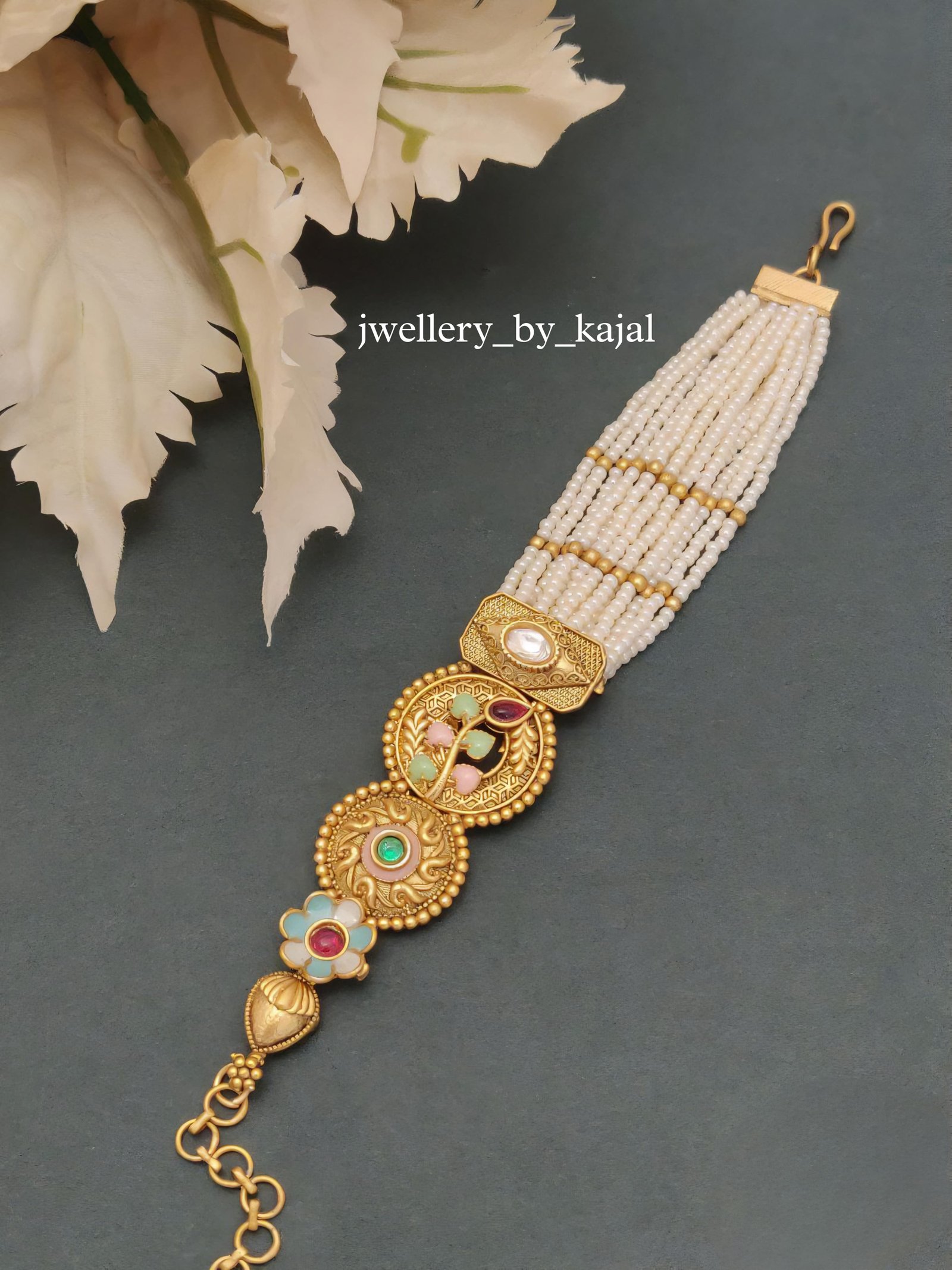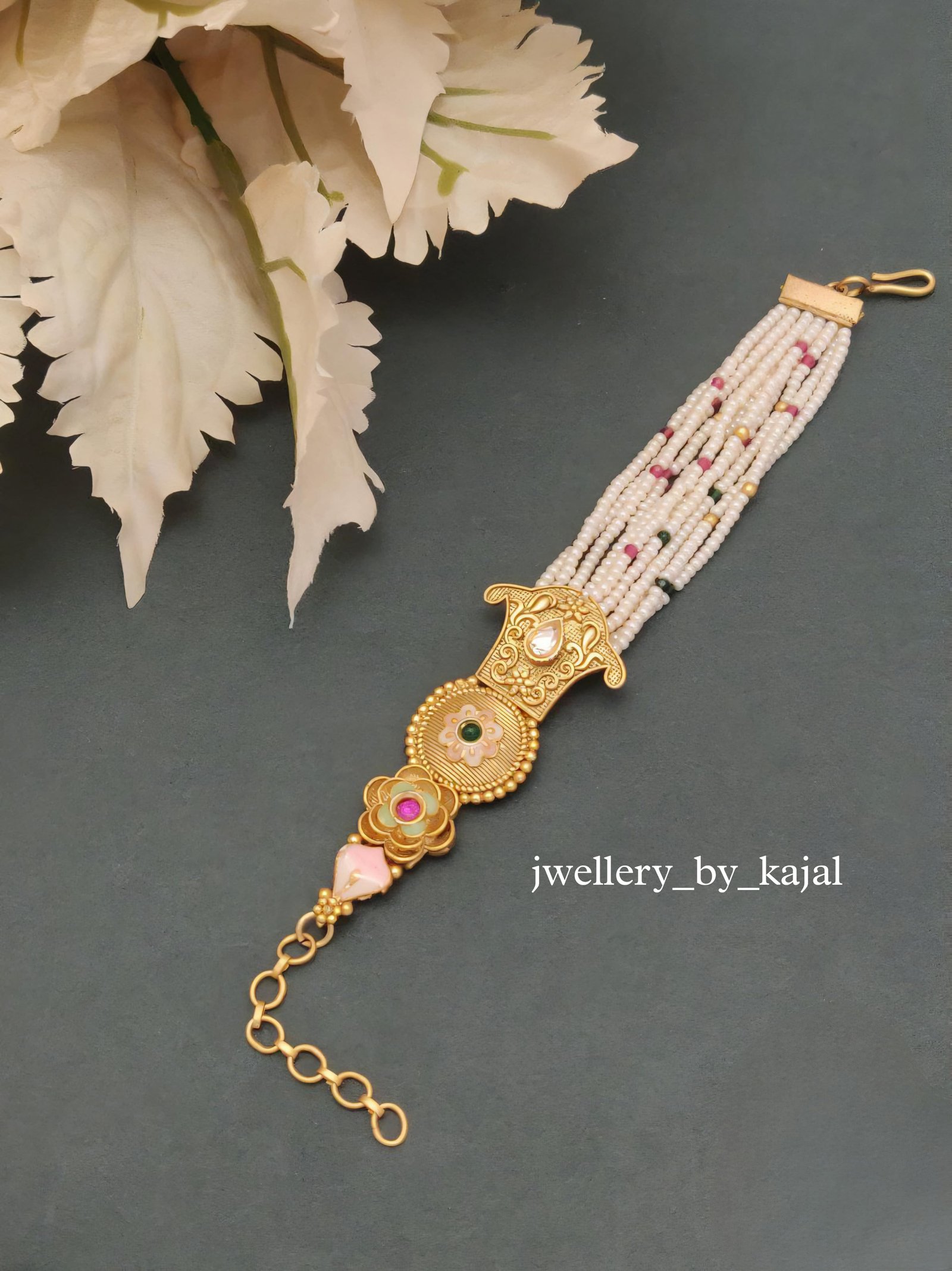 Colourful Pearl Brass Adjustable Bracelet with Kundan Work - Supreme Quality