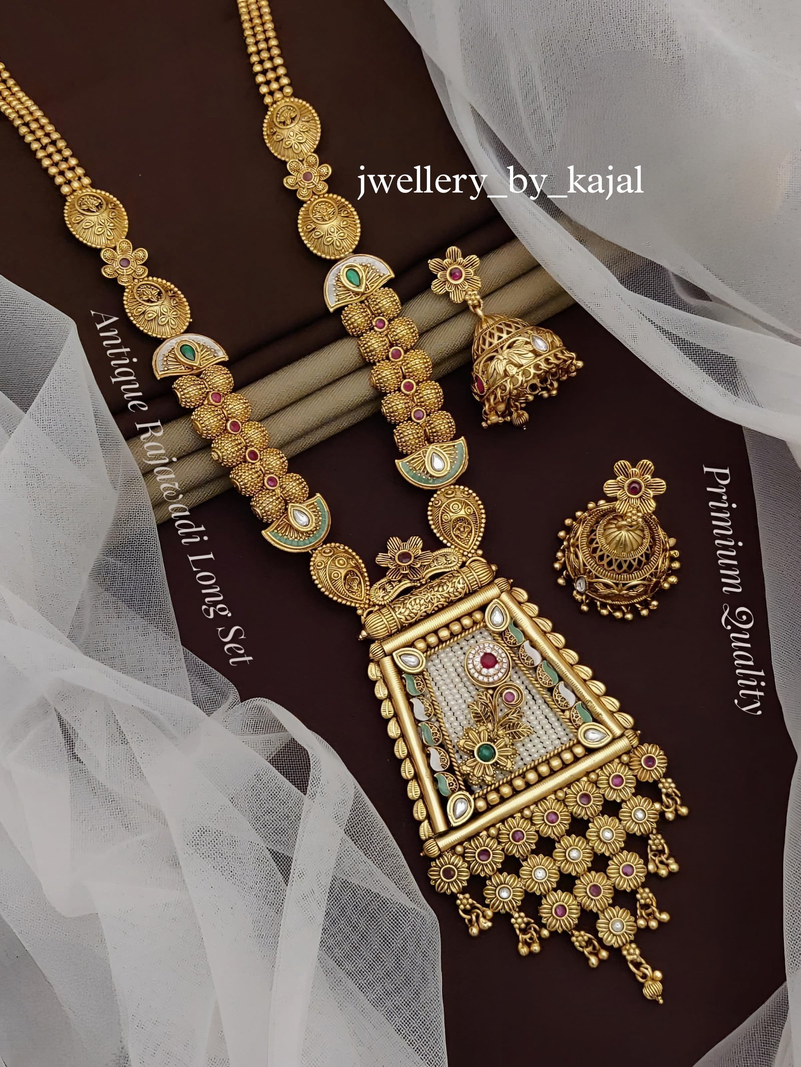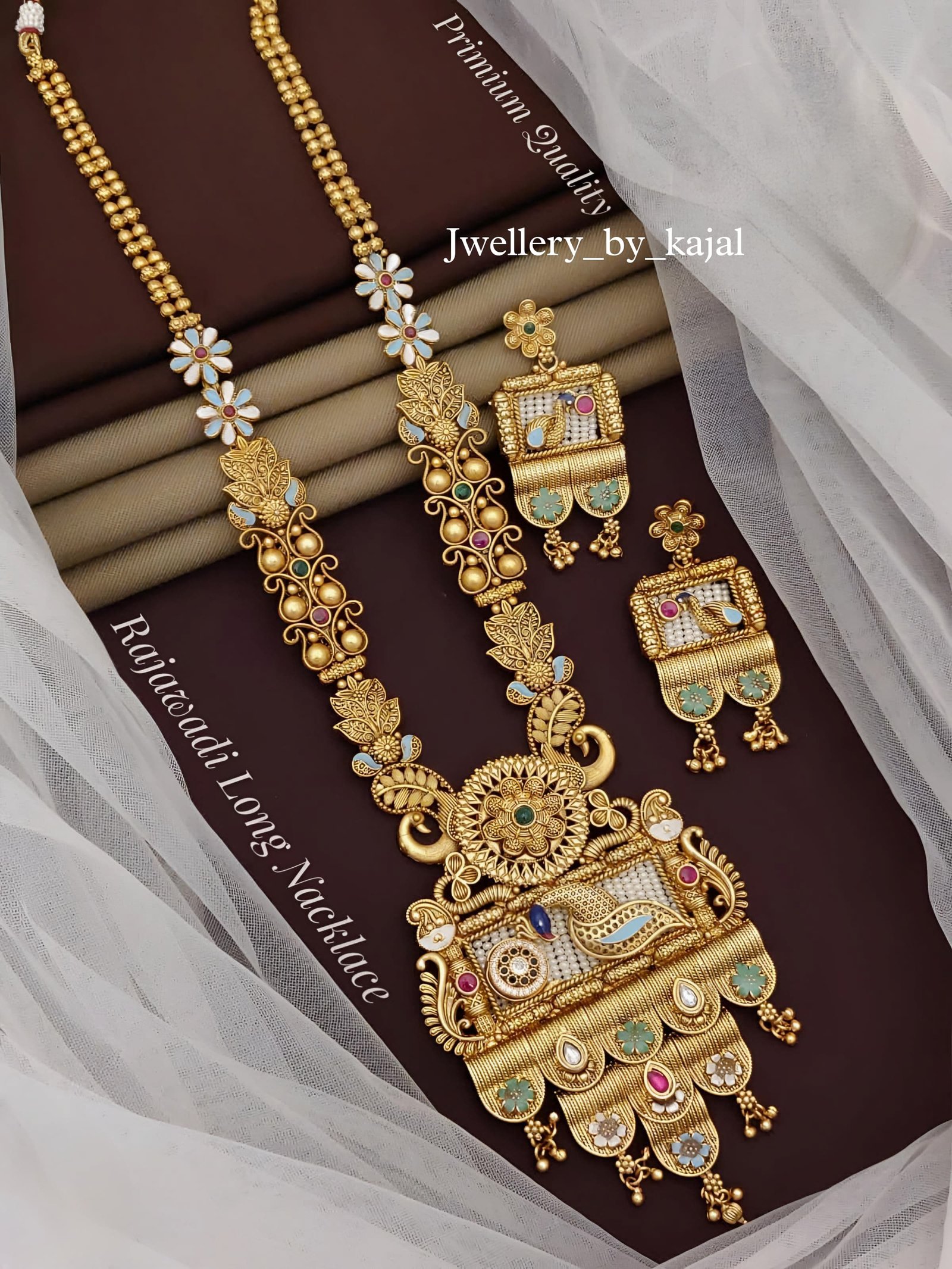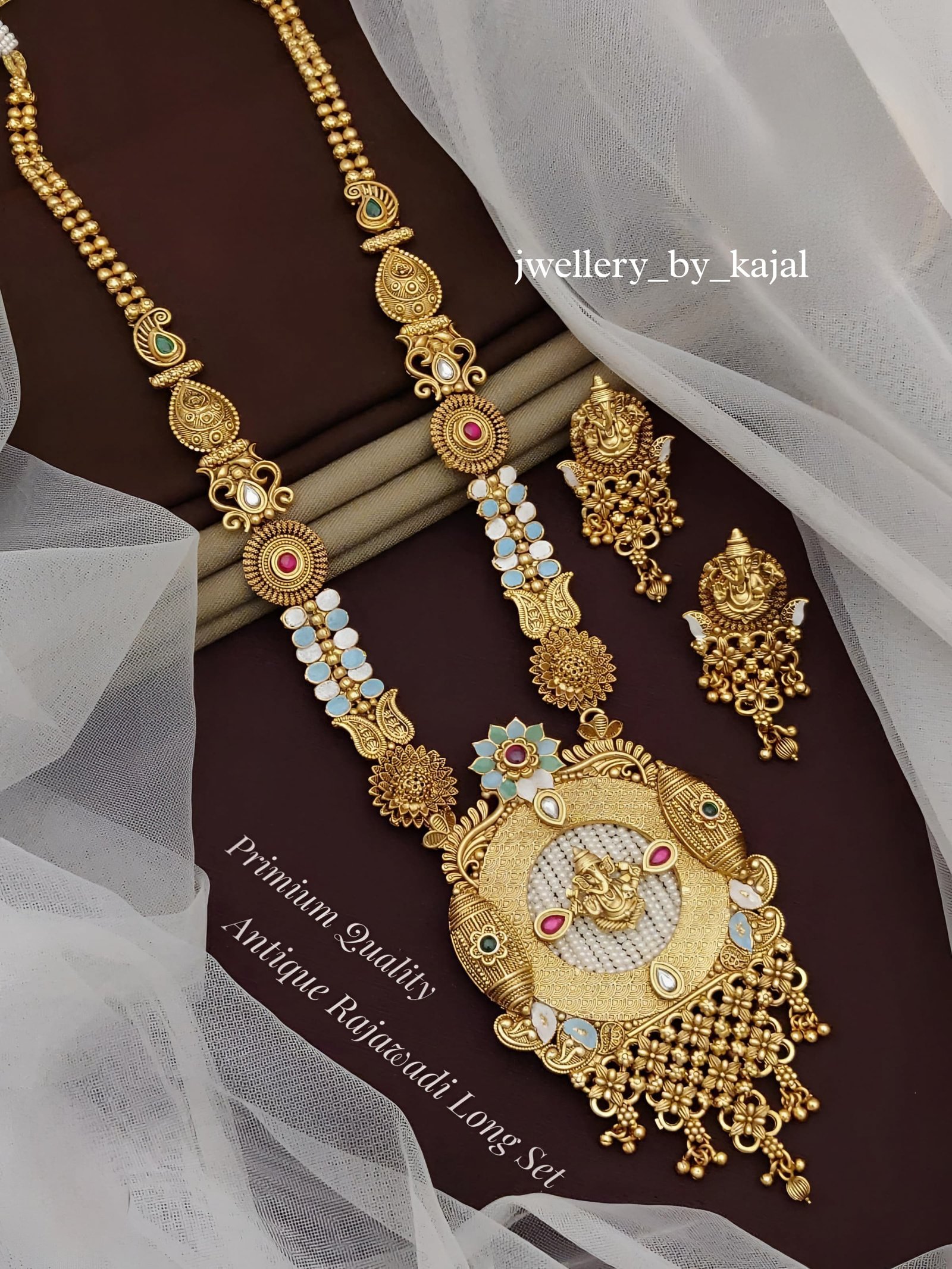 Festive Finesse Long Brass Necklace Set with Earrings for Special Occasions