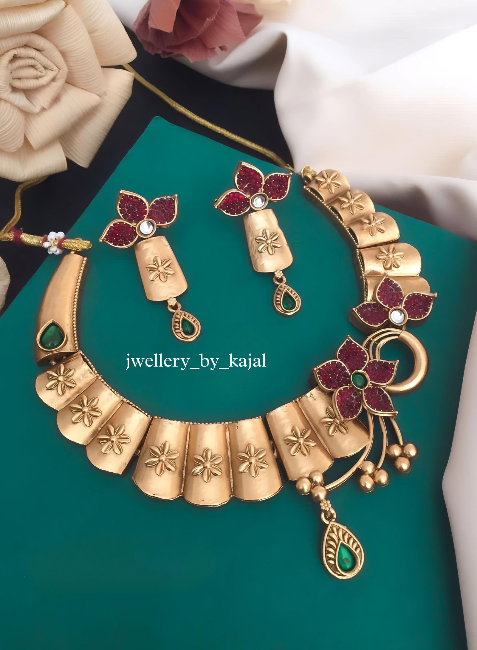 Folwer Red Golden Brilliance: Brass High Gold Necklace with Matching Earrings-SUPREME LUXURY JEWELRY
