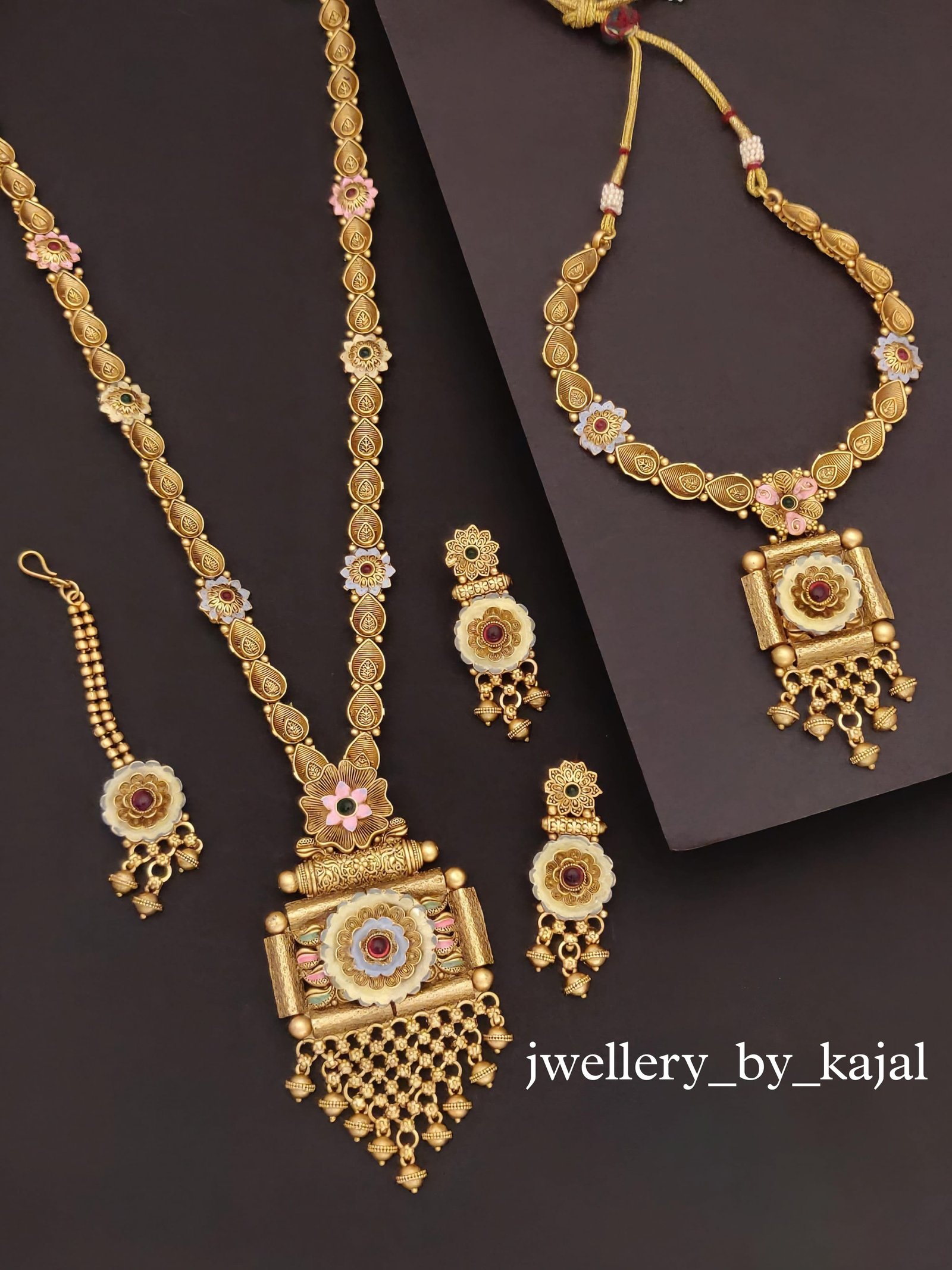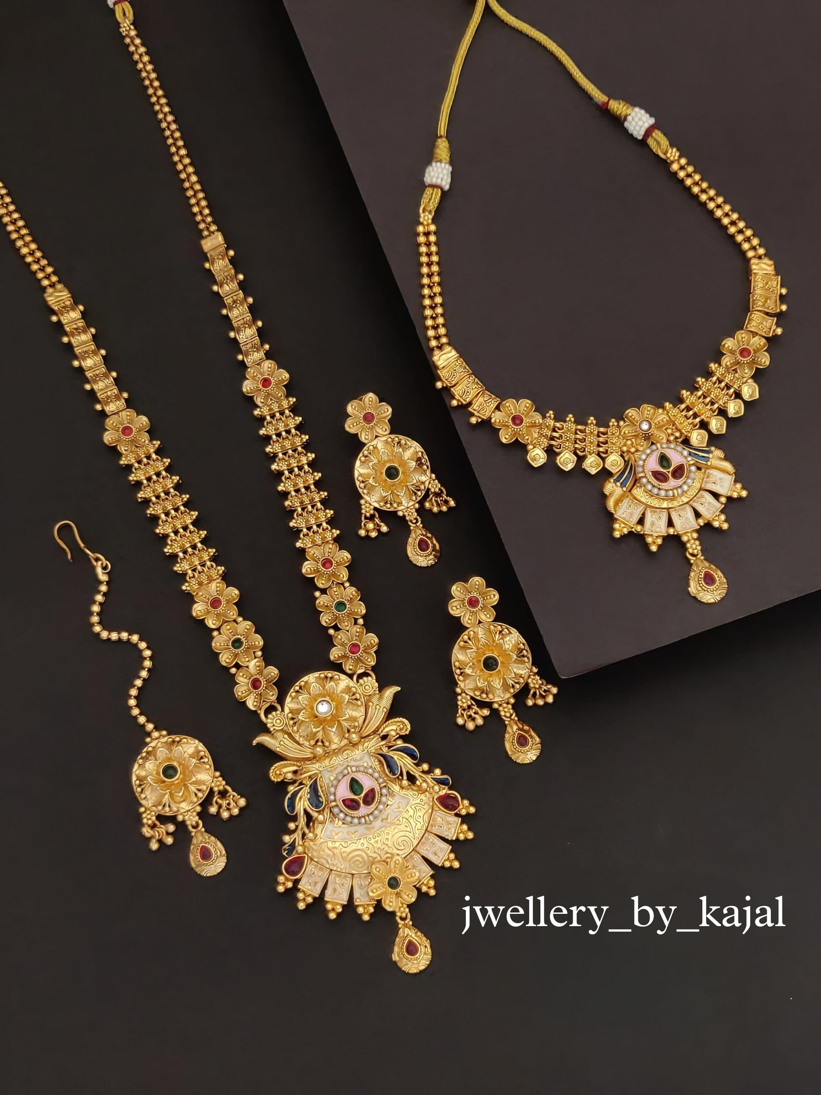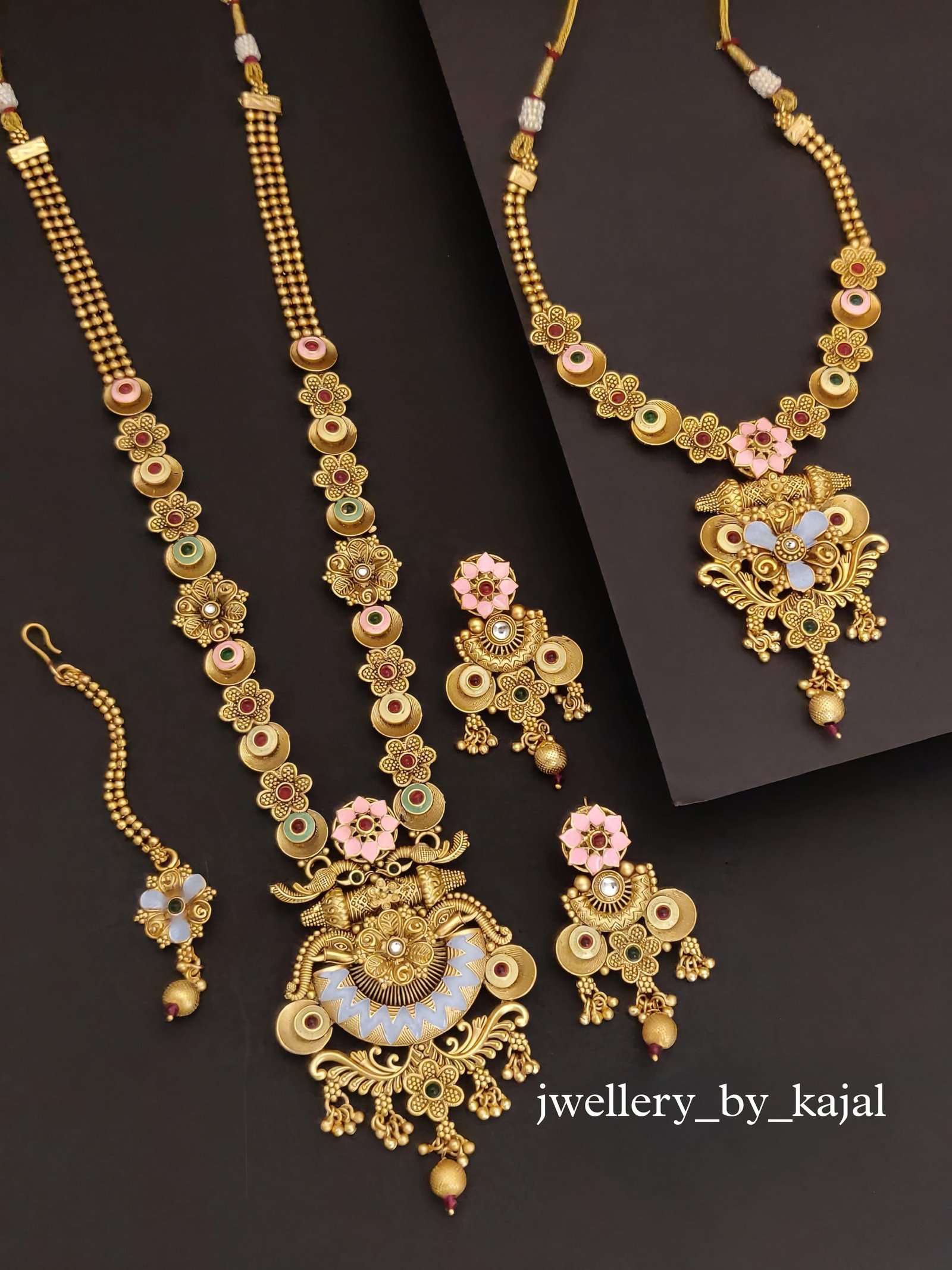INCLUDE :- COMBO SET WITH LONG SET, SHORT NECKLACES,EARRINGS SET WITH MANGA TICK