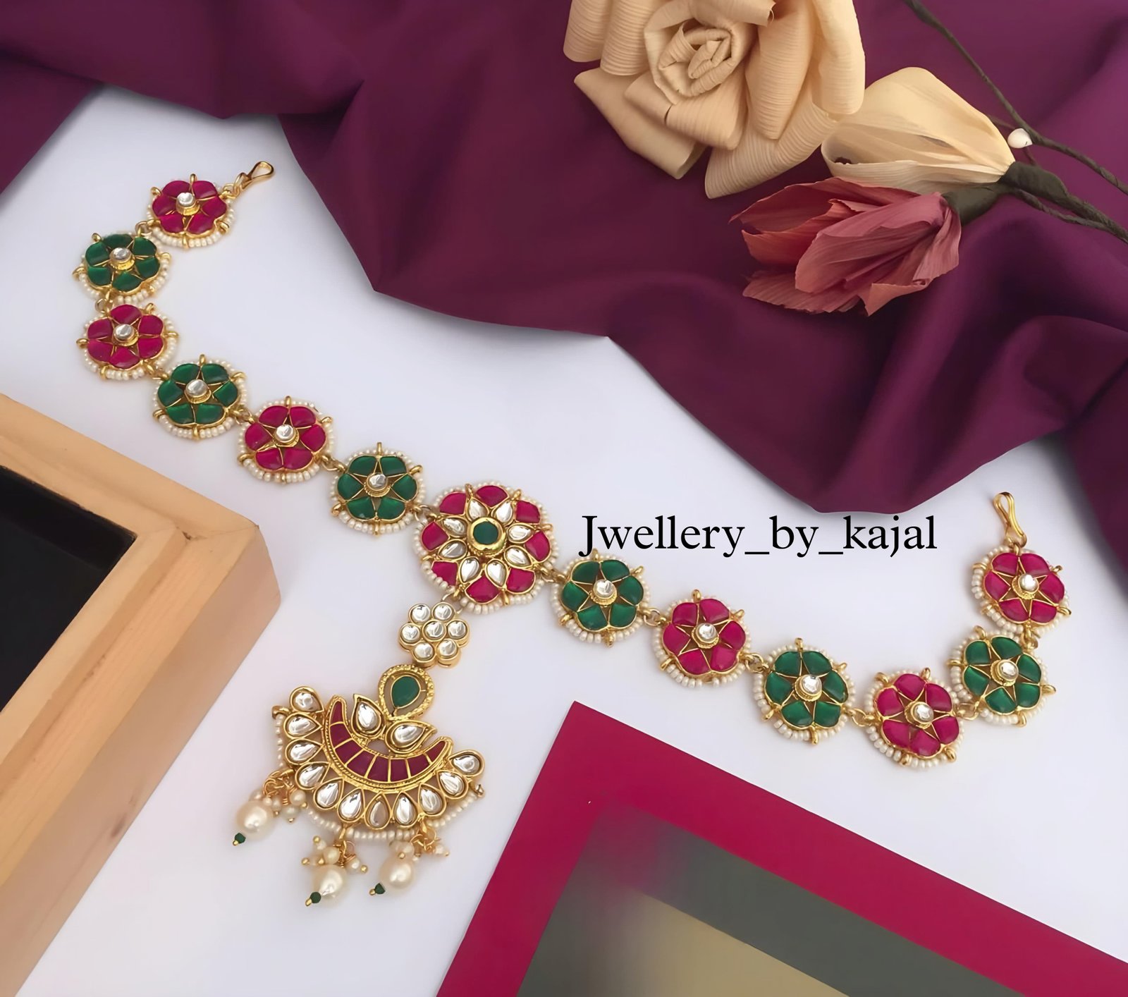Inspired by Voylla: Multicolor Kundan Maang Tikka & Matha Patti – Radiant Wedding Headpiece