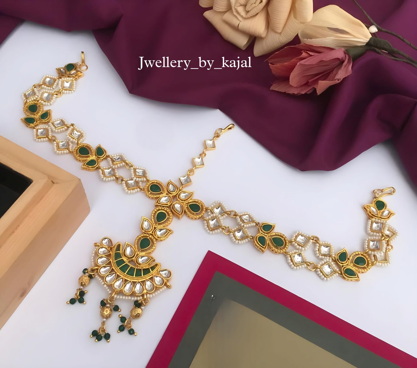 Add elegance to your bridal look with this stunning Kundan Maang Tikka & Matha Patti set, designed to mimic the beauty of real gold jewelry. Crafted with a high-gold finish, this set is ready in 1 to 2 days.