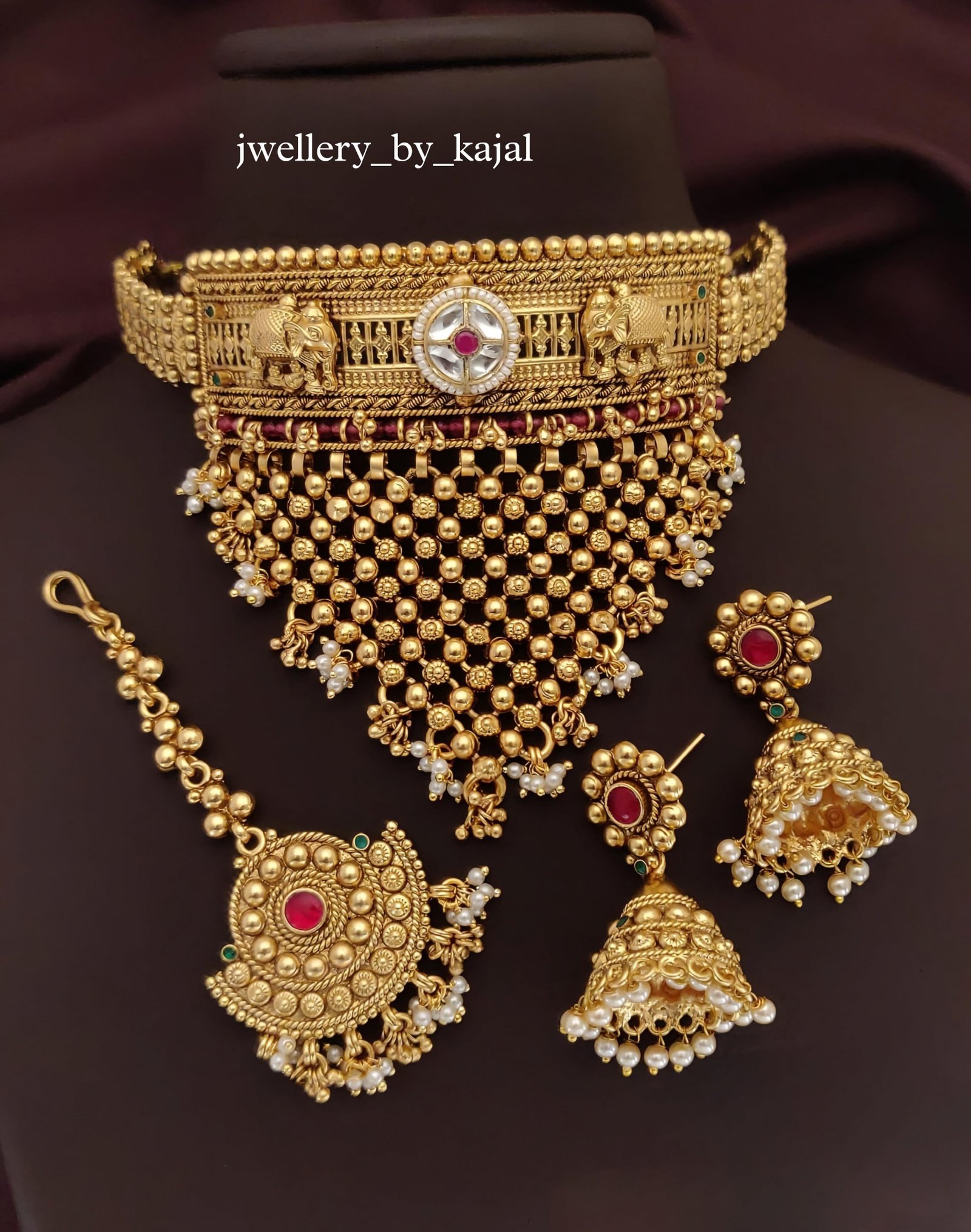 JWELLERY BY KAJAL Majestic High Gold Choker and Earring Set Rajasthani Collection