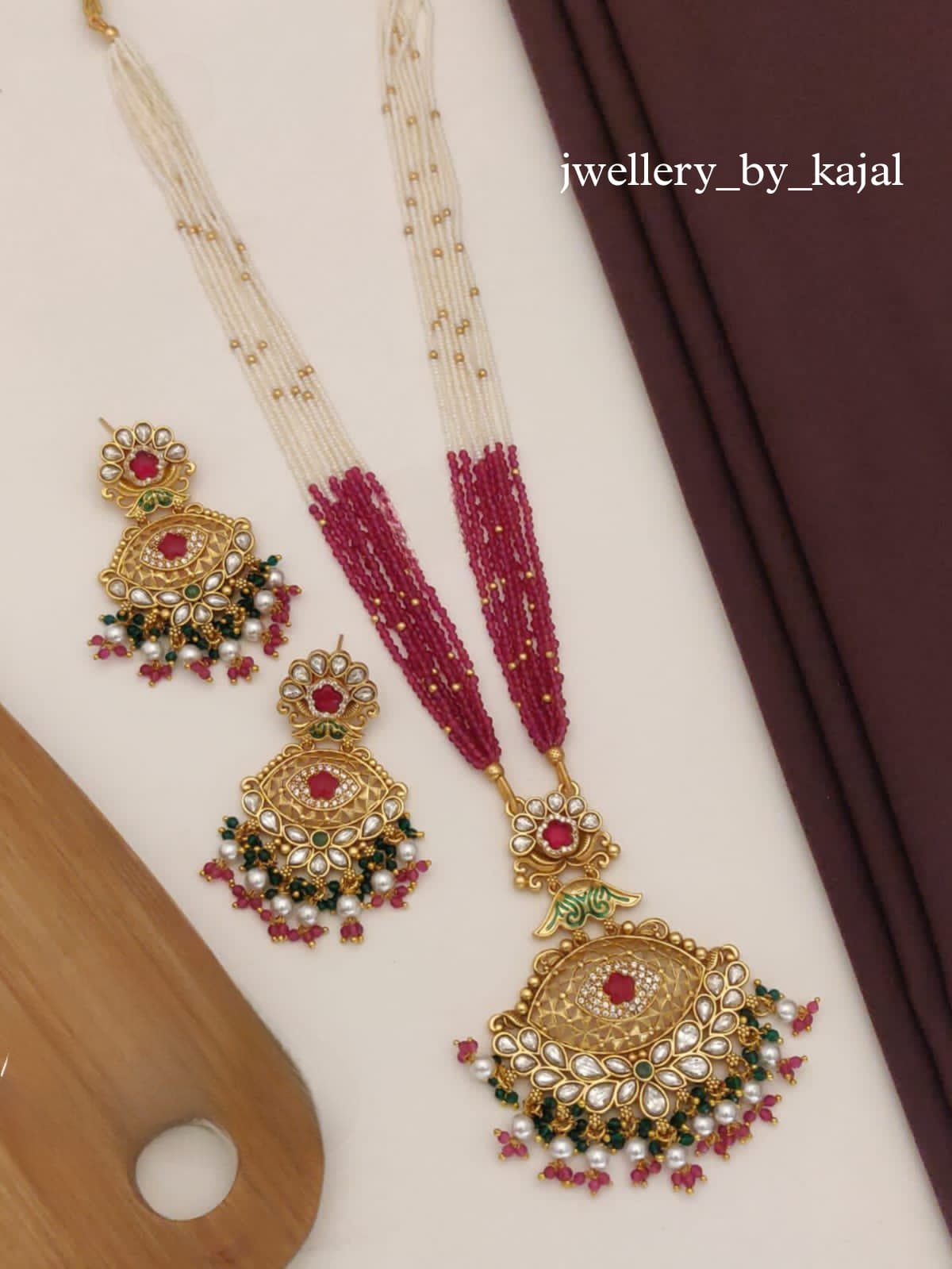 Long Kundan Mala Set with Earring- Red Green Peach C Green Sky