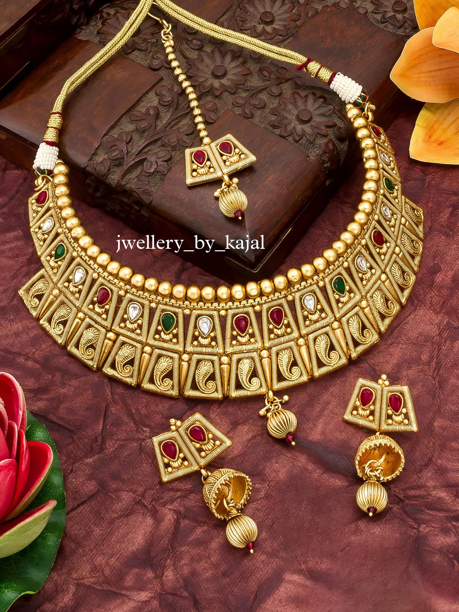Multi Stone Antique Choker Set with Earring And Mangtika- HIGH END JEWELLERY