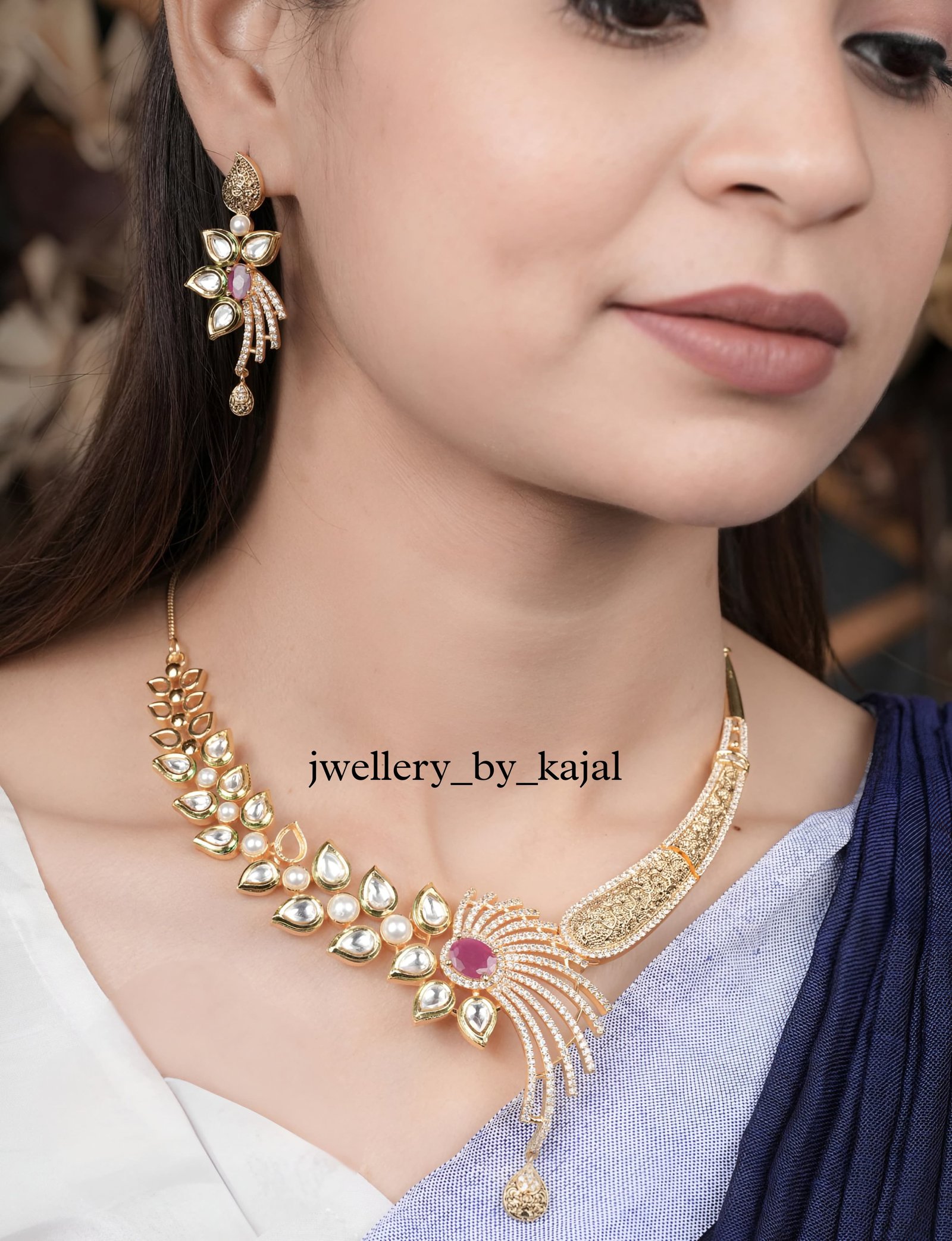 Rose Gold Kundan Necklace Set with Matching Earrings
