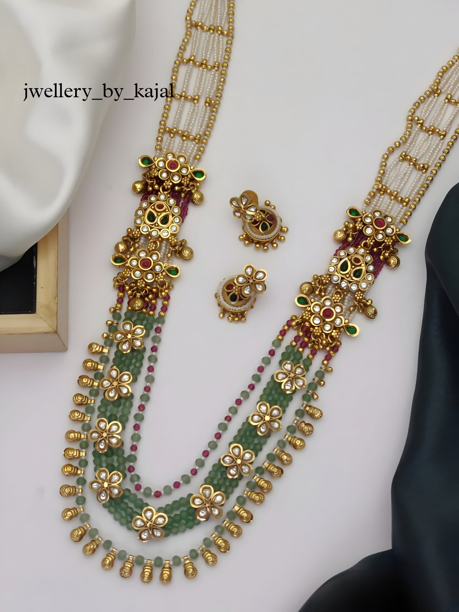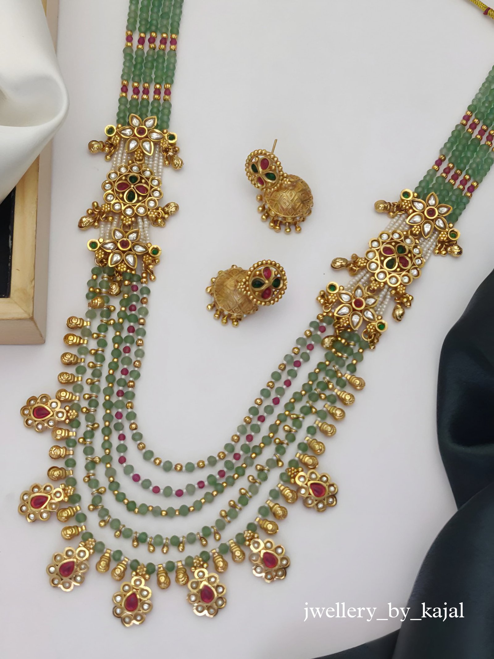 Royal Green Beaded Long Necklace Set with Kundan Pendant and Earrings