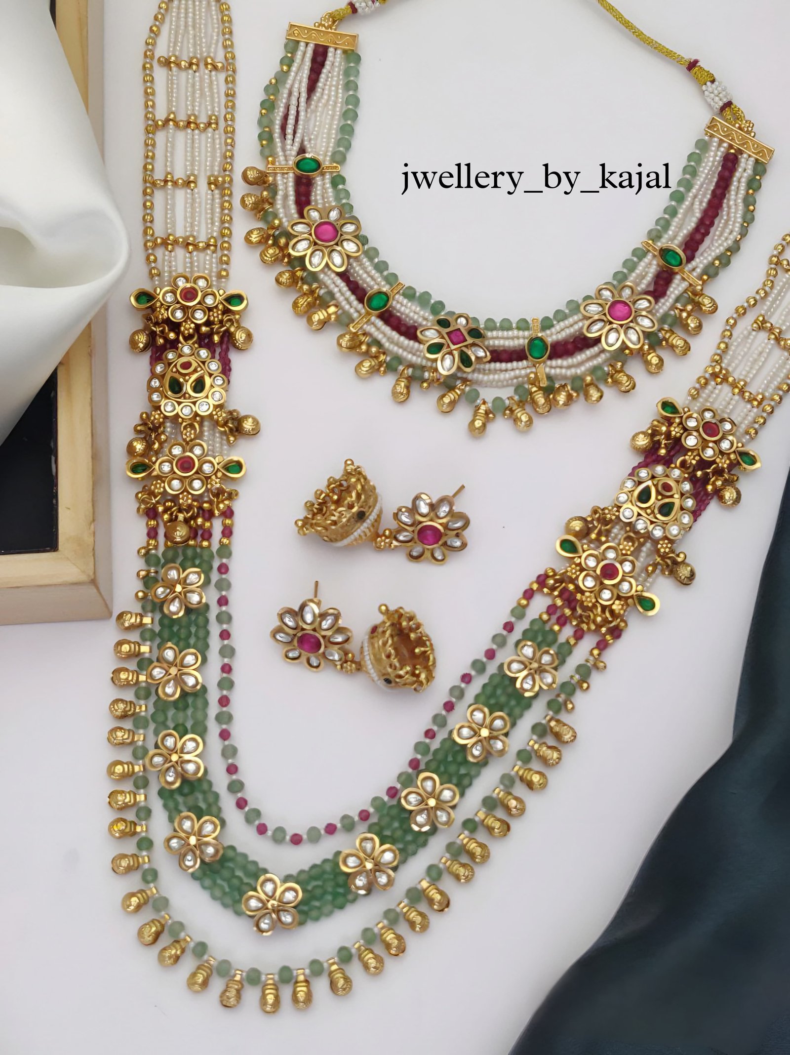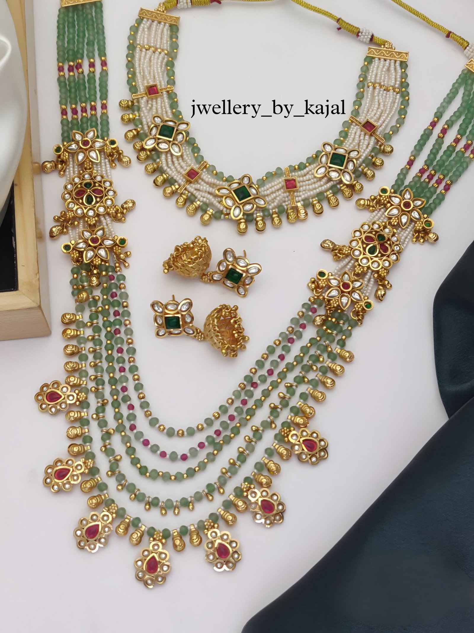 Royal Kundan Green Beaded Long Necklace with Earrings and Full Combo Set