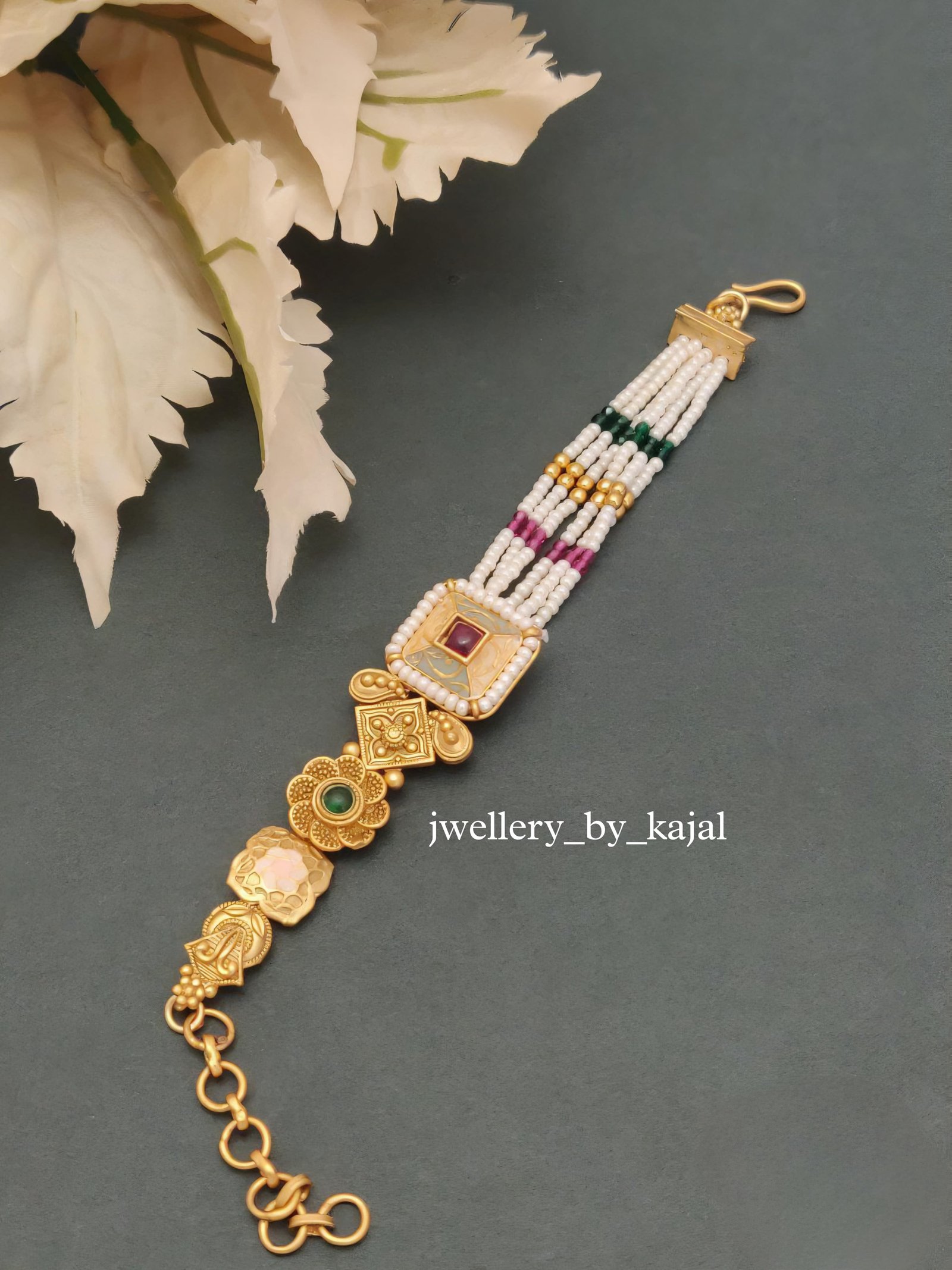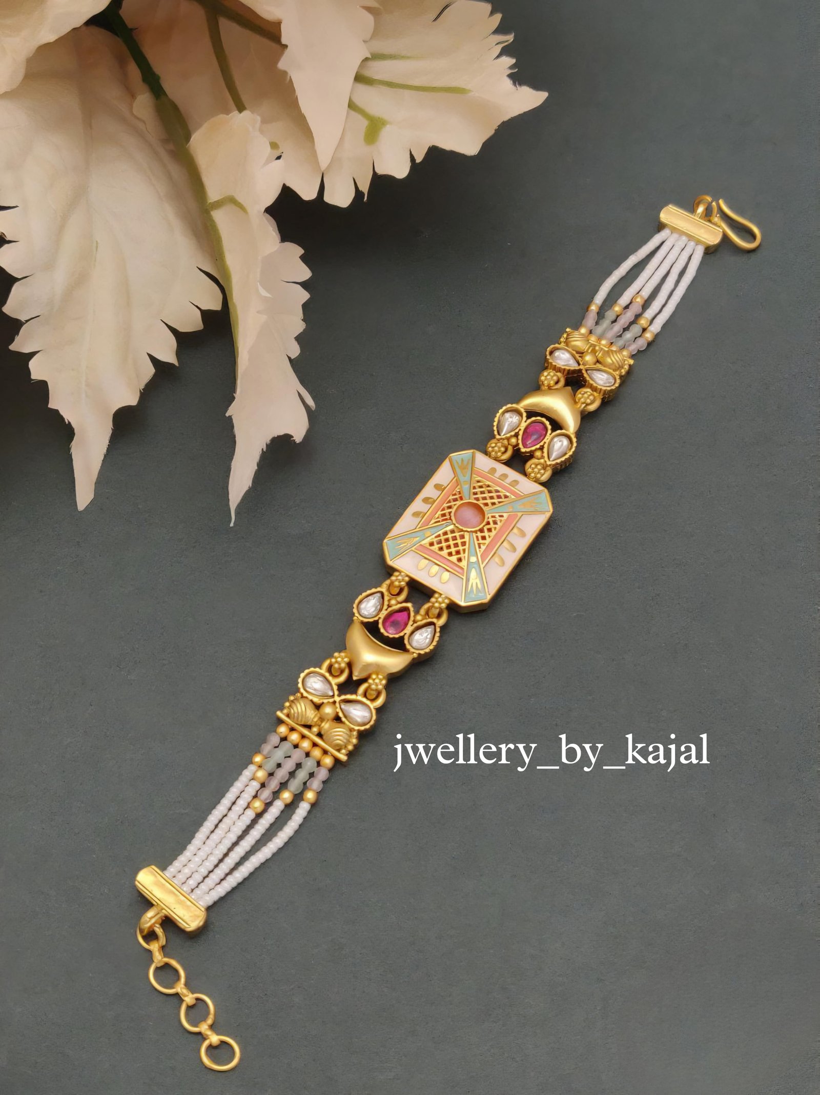Square Shape Pearl Brass Adjustable Bracelet with Kundan Work - Supreme Quality
